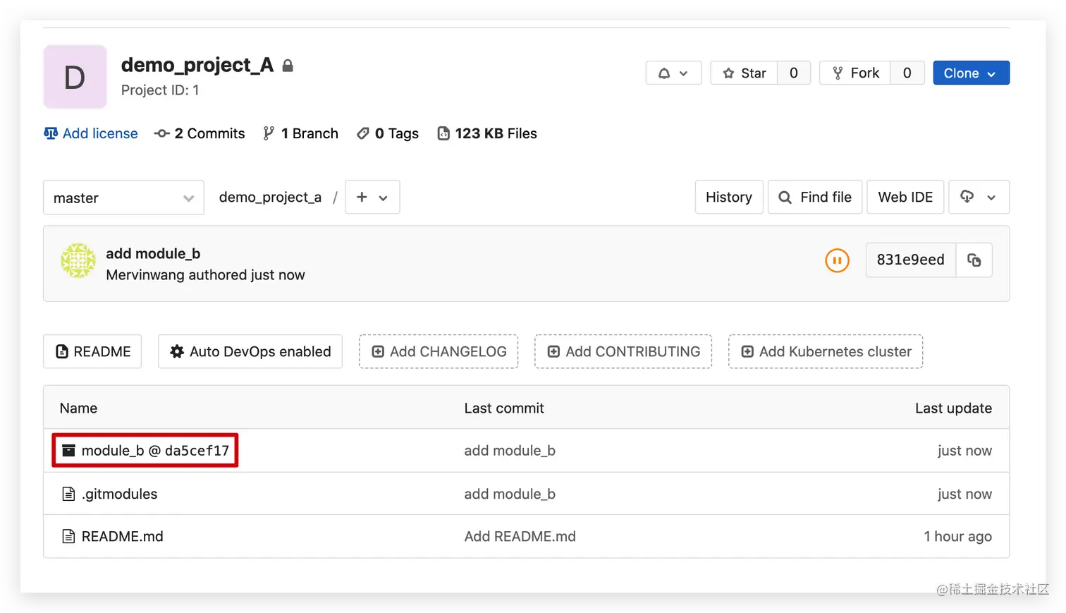 ➜ demo_project_a git:(master) ✗ git submodule add http://159.75.195.153/root/module_b.git module_b