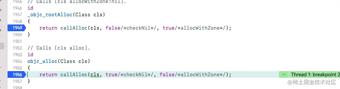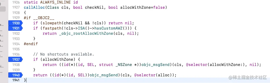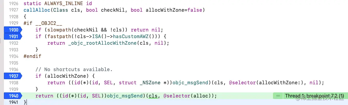 objc_alloc。记下来进入callAlloc,在该方法中打上断点: