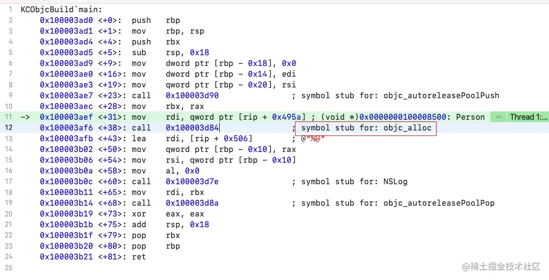 虽然动态调试的时候,流程确实是这样的;但是问题就来了,这个流程不符合我们的尝试,因为alloc函数里面是_objc_rootAlloc,可是什么时候变成了objc_alloc呢?