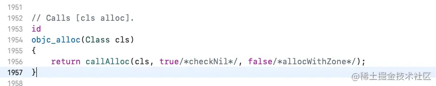 callAlloc,但是传入的参数不同:/******** _objc_rootAlloc ********/ id _objc_rootAlloc(Class cls) { return callAlloc(cls, false/*checkNil*/, true/*allocWithZone*/); } /******** objc_alloc ********/ // Calls [cls alloc]. id objc_alloc(Class cls) { return callAlloc(cls, true/*checkNil*/, false/*allocWithZone*/); }