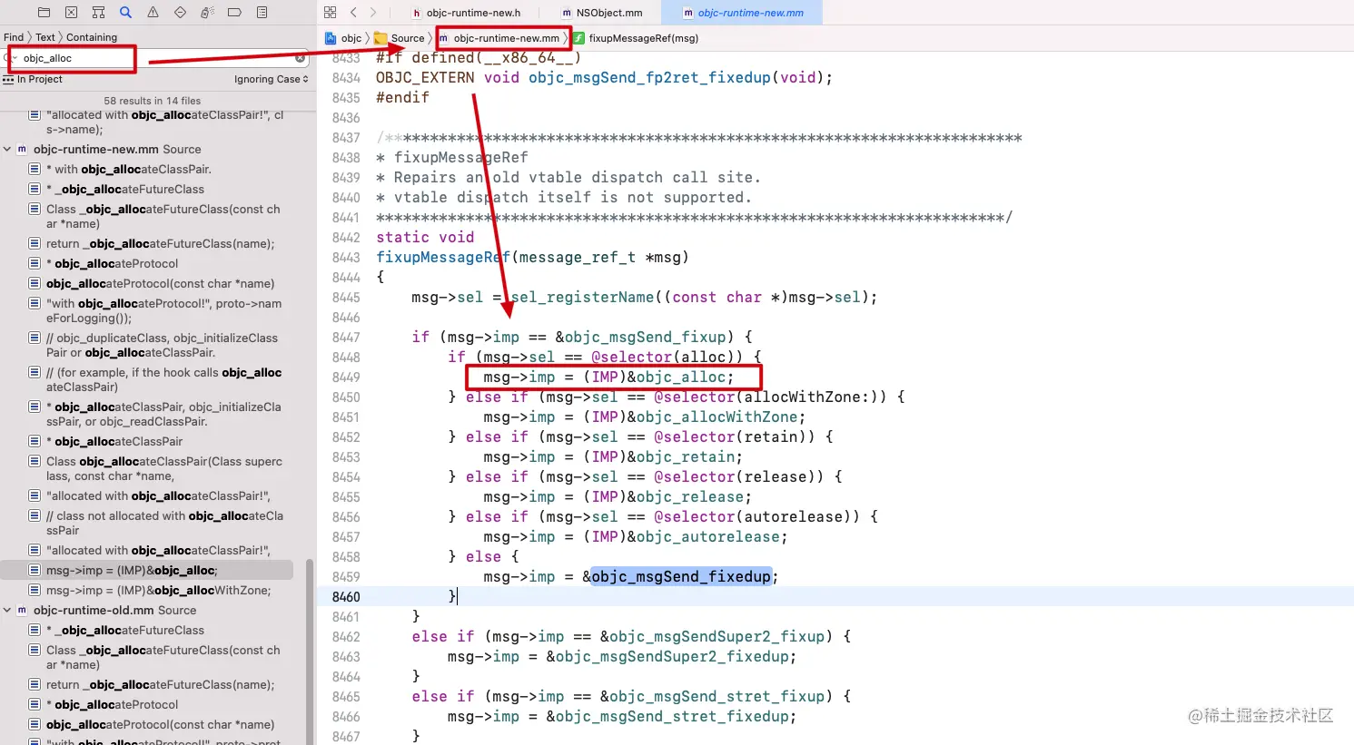 既然动态调试的时候,汇编代码告诉我们首先进入的是objc_alloc,那我们就在源码中搜寻一下objc_alloc。(cmd + shift + O)