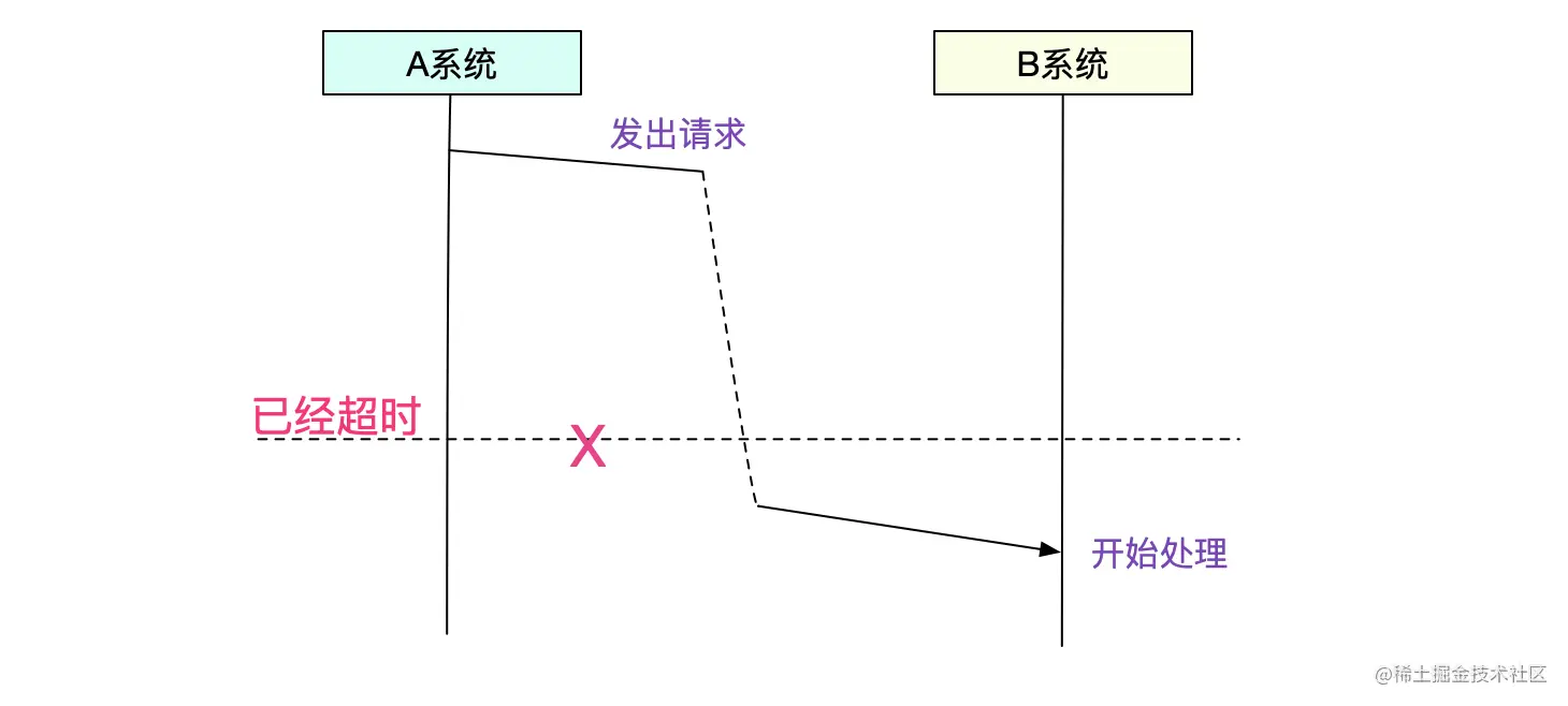 搜索一下日志,发现A系统在发出5s后超时。B系统在将近8s后才收到请求,也就是说B系统还没开始处理,A系统就超时了。