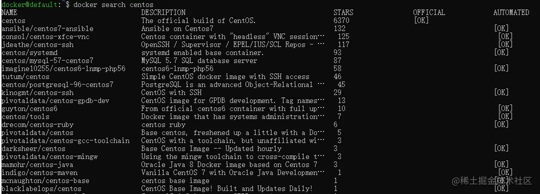 搜索非官方发布的centos镜像,搜索结果只展示名称和热度,列之间用TAB键隔开