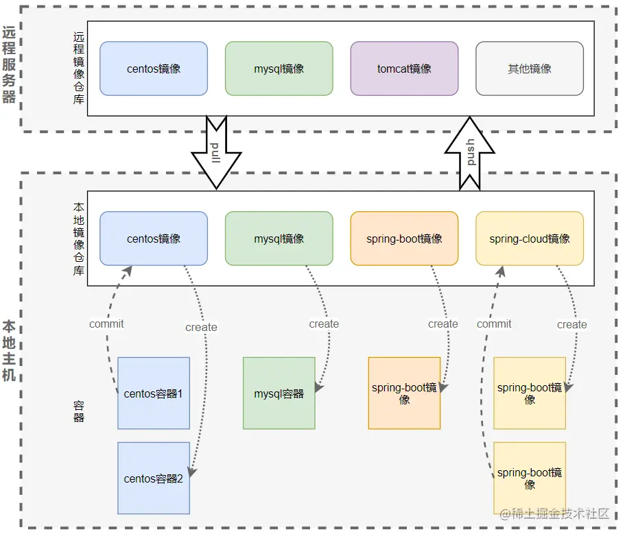 通过pull命令可以把远程仓库的镜像下载到本地,通过push命令可以把本地仓库的镜像推送到远程