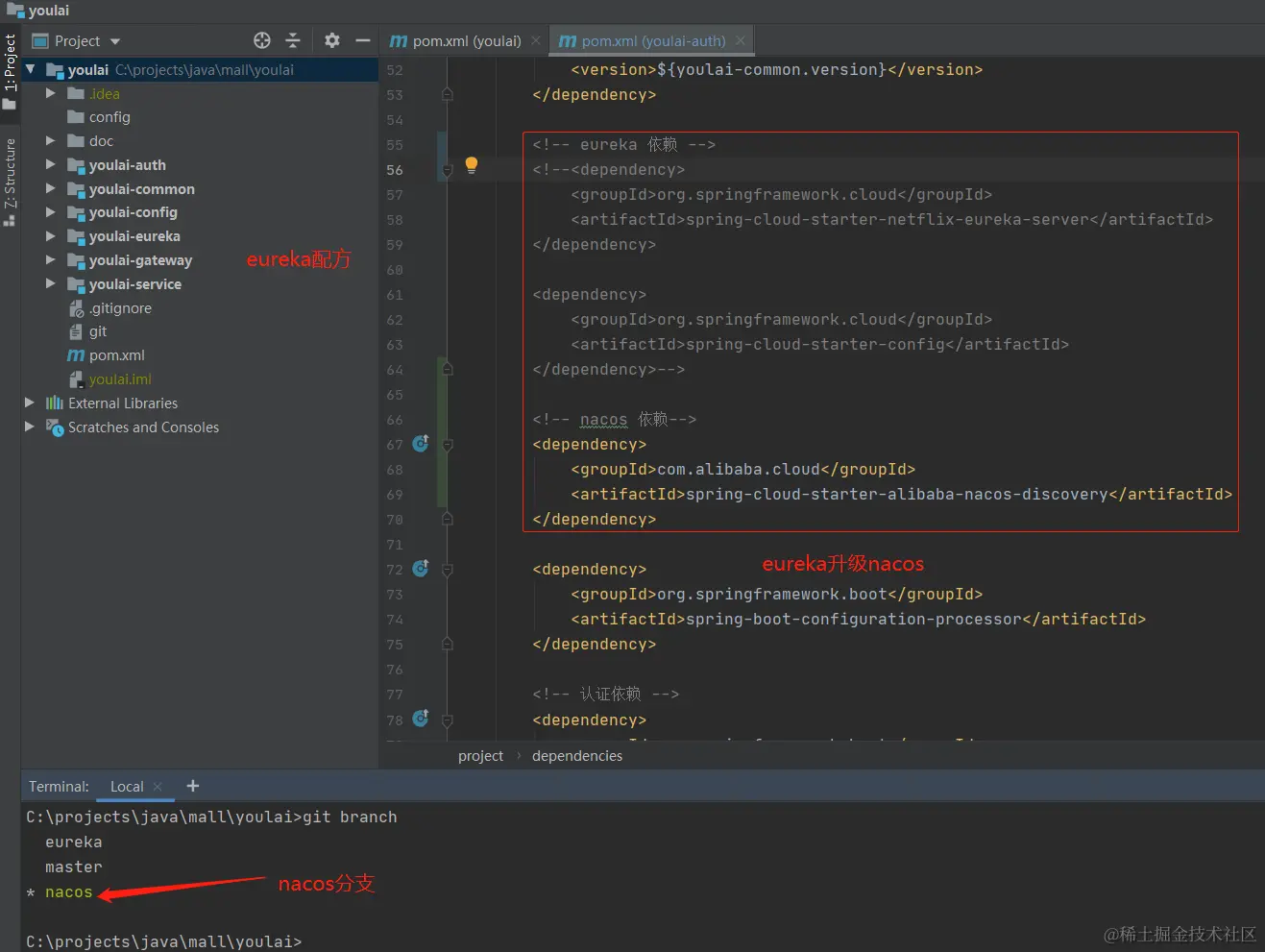 本篇项目实战是基于开源 有来商城youlai-mall 使用的微服务基础脚手架 youlai 这个项目,原先使用的是eureka,现在在此基础上创建个nacos分支,并在这个分支上完成eureka到nacos的升级,话不多说,一张图说明。