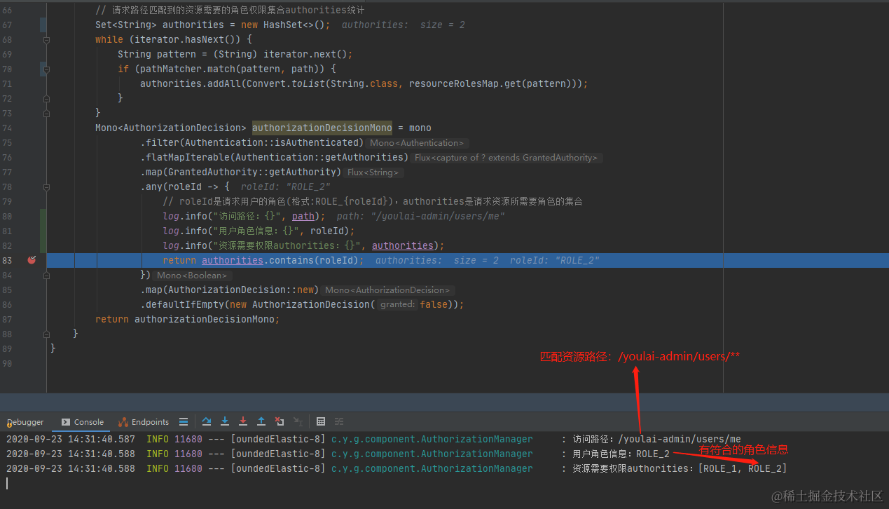 第4处根据请求路径去匹配resourceRolesMap的资url(Ant Path匹配规则),得到对应资源所需角色信息添加到authorities。