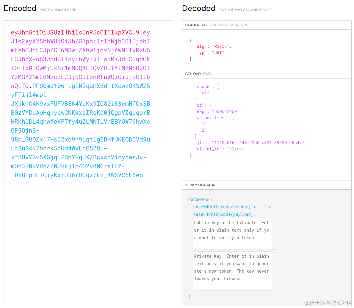 JWT(JSON Web Token)它没啥悬乎的,就是一个特殊的token,最大的特性就是无状态,因为它本身可以携带用户的信息(用户ID、用户名、用户的角色集合等),我们先看下一个解析过后的JWT是什么样子的。