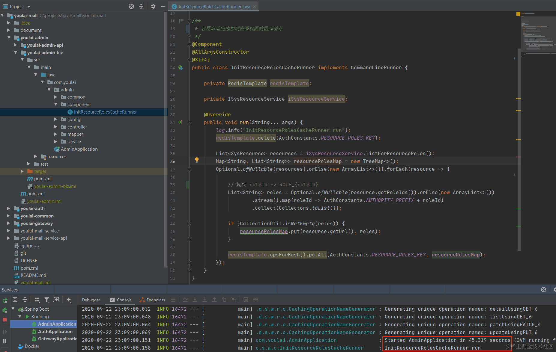 那么这里的业务逻辑是在容器初始化完成之后将从MySQL读取到资源权限数据加载到Redis缓存中,正中下怀,来看下具体实现吧。