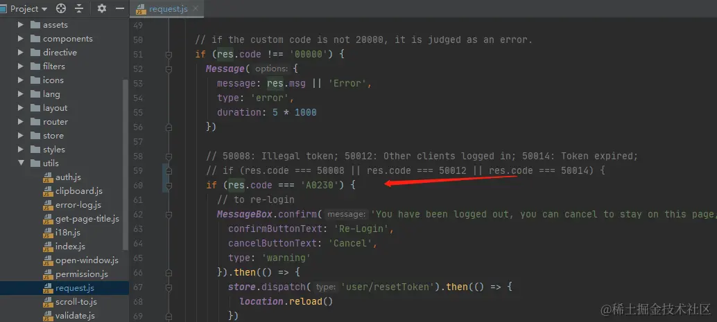 打开之前搭建好的前端管理平台youlai-mall-admin-web,修改src/util/request.js文件中的无效token的响应码为“A0230”,这样在token无效的情况下提示重新登录