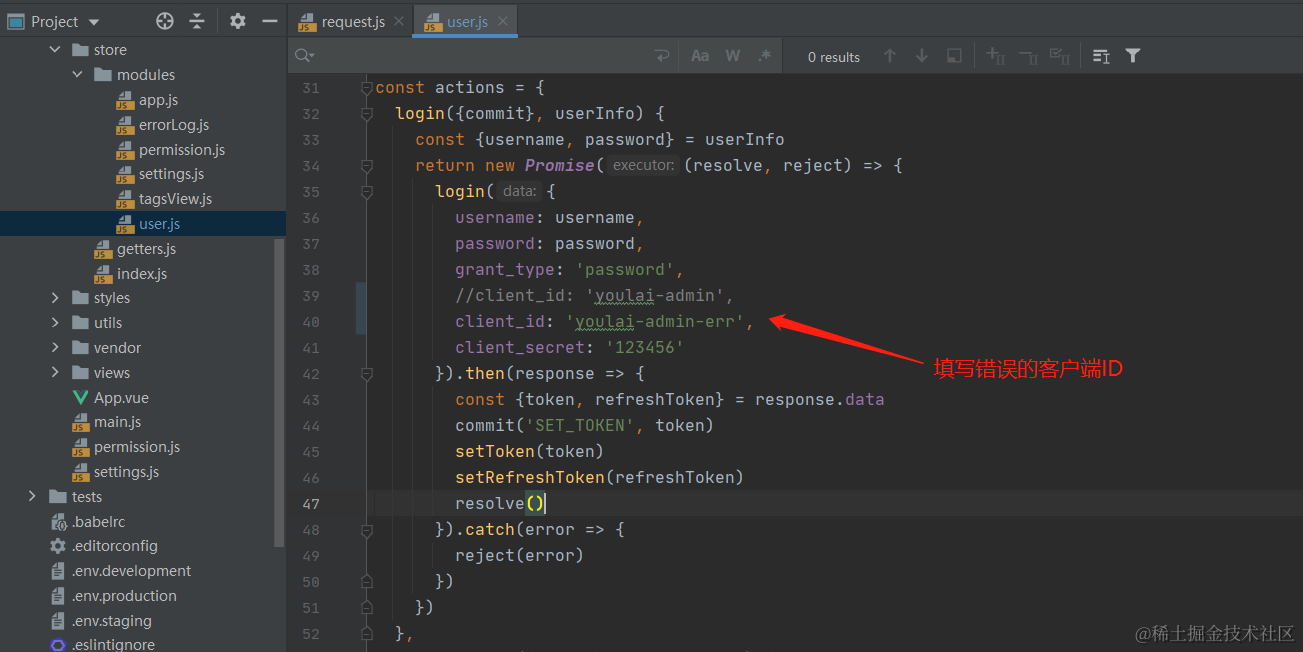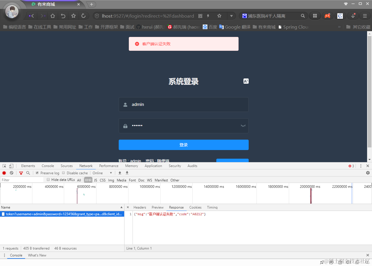 先看下客户端认证异常出现的位置,首先把客户端ID改成错的。