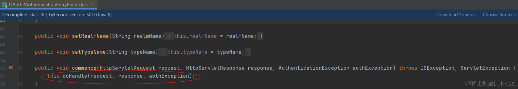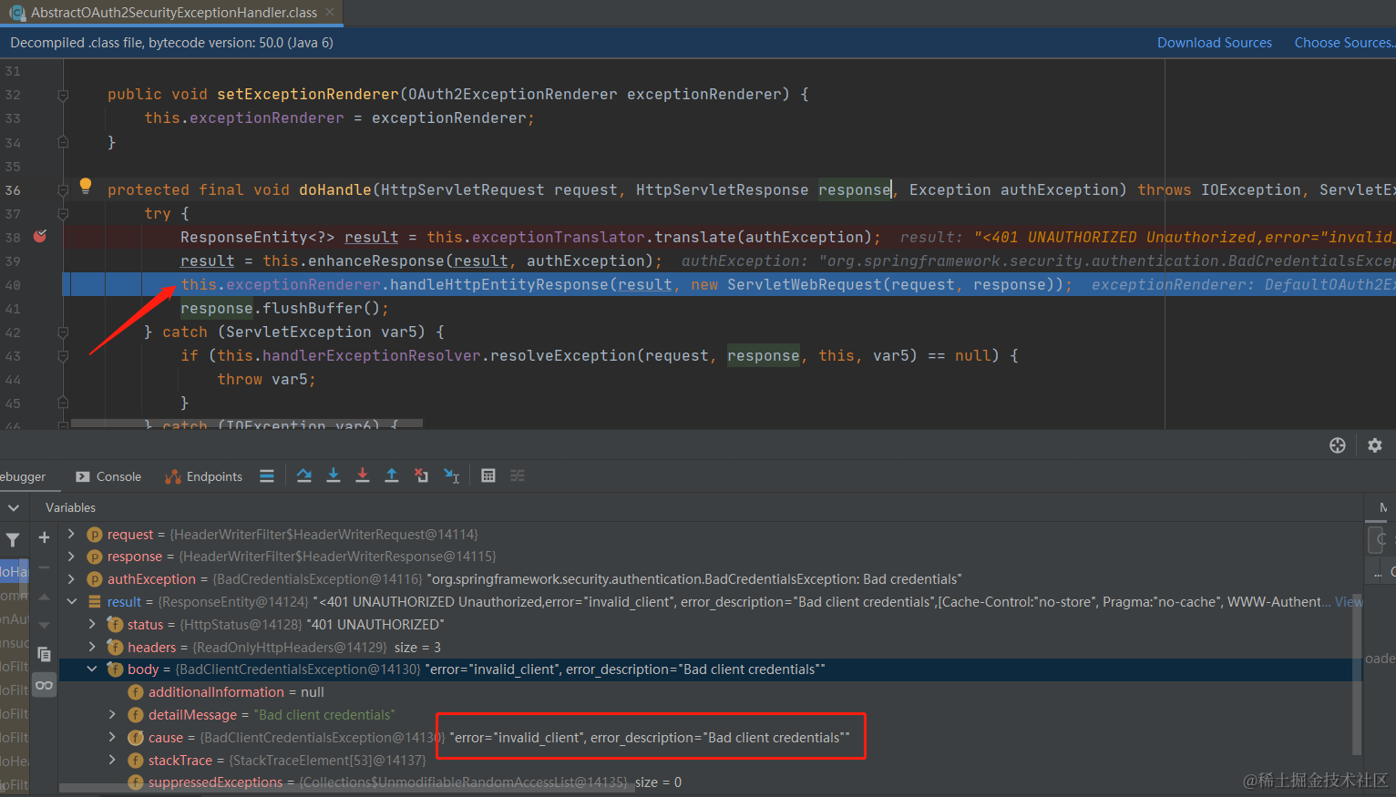 最后异常定格在AbstractOAuth2SecurityExceptionHandler#doHandle方法上,如下图: