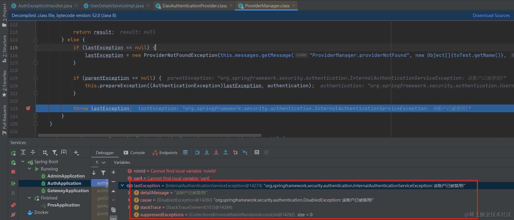首先我们需要把数据库youlai的表sys_user的字段status设置为0,表示不可用状态,然后输入正确的用户名和密码,看看跑出来的原生异常信息,可惜的是这个异常没有打印堆栈信息,不过没关系,我们断点调试下,最终定位到ProviderManager#authenticate方法抛出的异常,异常类型是InternalAuthenticationServiceException。