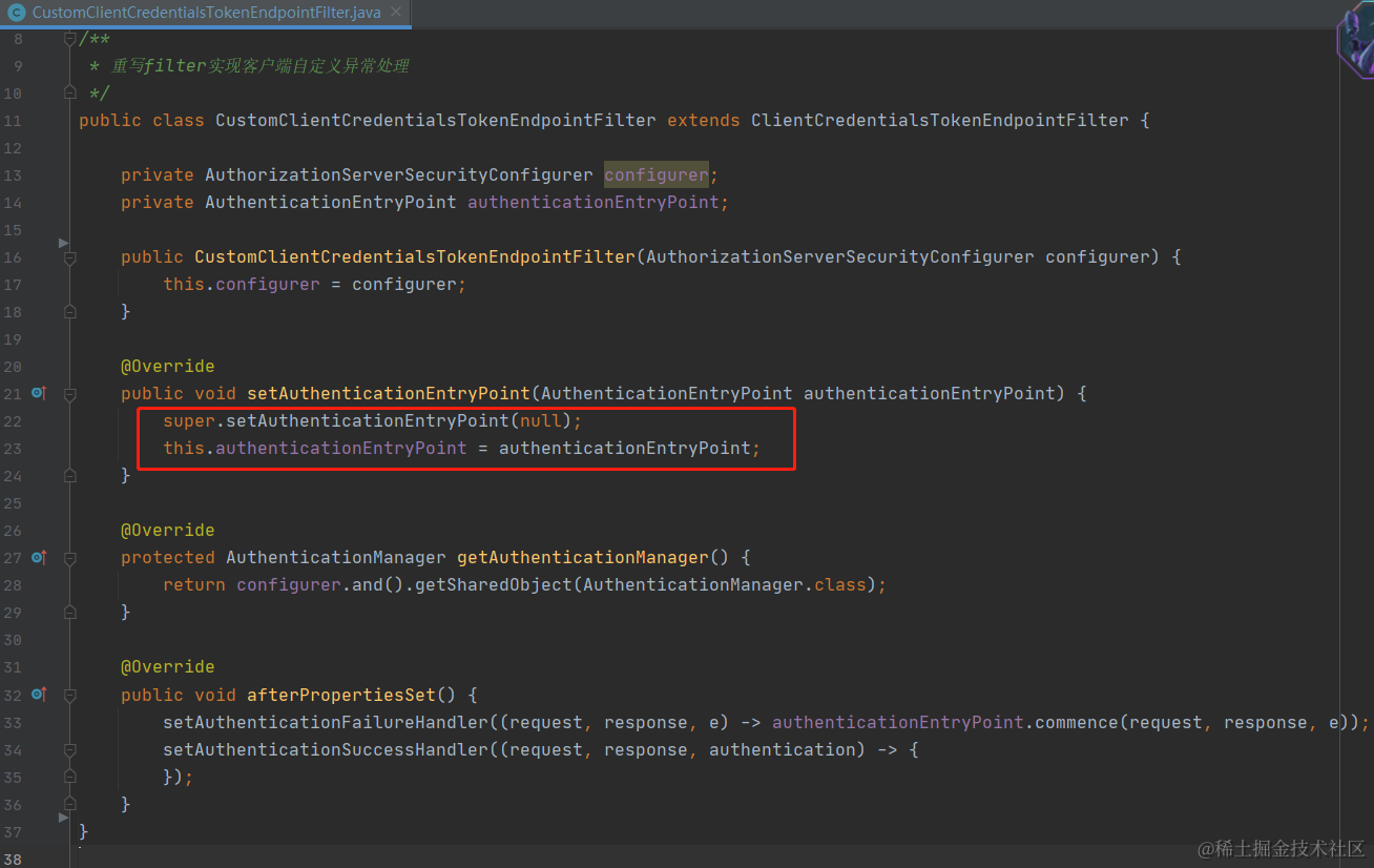 上面我们得知客户端的认证失败异常是过滤器ClientCredentialsTokenEndpointFilter转交给OAuth2AuthenticationEntryPoint得到响应结果的,既然这样我们就可以重写ClientCredentialsTokenEndpointFilter然后使用自定义的AuthenticationEntryPoint替换原生的OAuth2AuthenticationEntryPoint,在自定义AuthenticationEntryPoint处理得到我们想要的异常数据。
