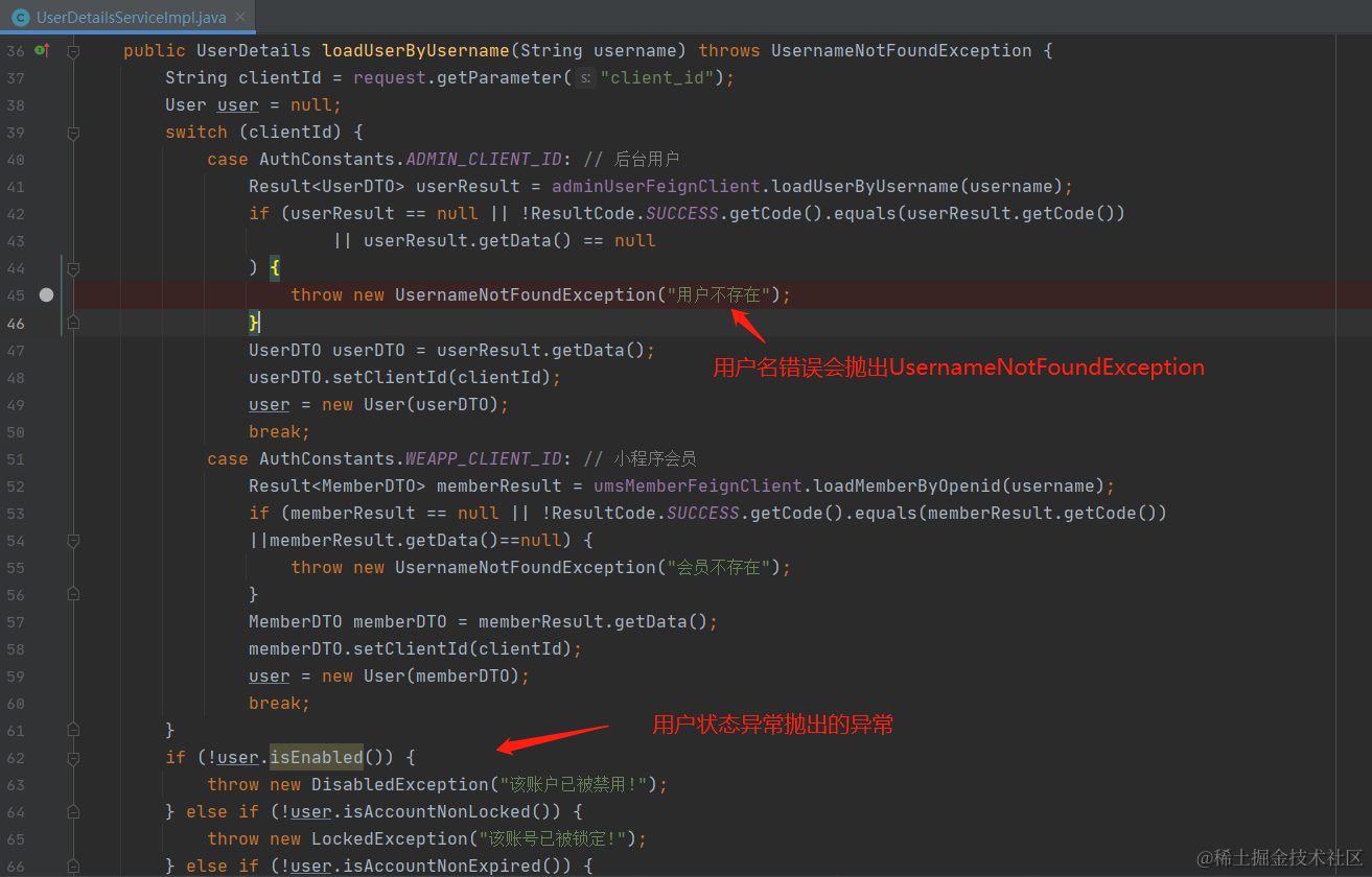 在异常处理之前先看下UserDetailsServiceImpl#loadUserByUsername方法抛出的异常信息,如下图: