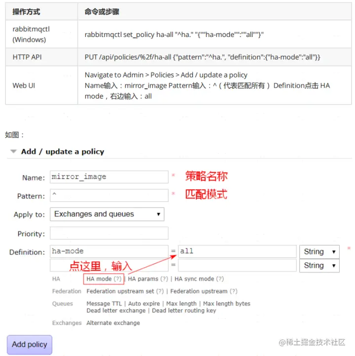 集群方式下,队列和消息是无法在节点之间同步的,因此需要使用RabbitMQ的镜像队列机制进行同步。