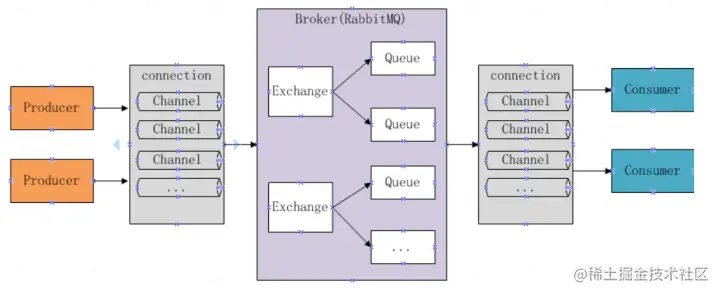 名词解释 Broker :即RabbitMQ的实体服务器。提供一种传输服务,维护一条从生产者到消费者的传输线路,保证消息数据能按照指定的方式传输。 Exchange :消息交换机。指定消息按照什么规则路由到哪个队列Queue。 Queue :消息队列。消息的载体,每条消息都会被投送到一个或多个队列中。 Binding :绑定。作用就是将Exchange和Queue按照某种路由规则绑定起来。 Routing Key:路由关键字。Exchange根据Routing Key进行消息投递。定义绑定时指定的关键字称为Binding Key。 Vhost:虚拟主机。一个Broker可以有多个虚拟主机,用作不同用户的权限分离。一个虚拟主机持有一组Exchange、Queue和Binding。 Producer:消息生产者。主要将消息投递到对应的Exchange上面。一般是独立的程序。 Consumer:消息消费者。消息的接收者,一般是独立的程序。 Connection:Producer 和Consumer 与Broker之间的TCP长连接。 Channel:消息通道,也称信道。在客户端的每个连接里可以建立多个Channel,每个Channel代表一个会话任务。在RabbitMQ Java Client API中,channel上定义了大量的编程接口。