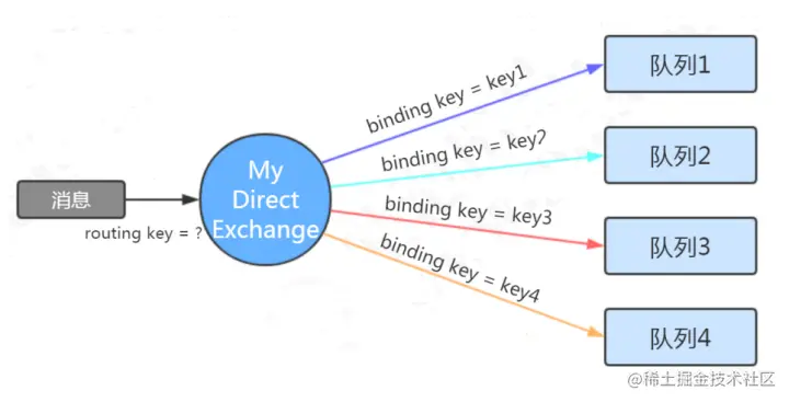定义:直连类型的交换机与一个队列绑定时,需要指定一个明确的binding key。 路由规则:发送消息到直连类型的交换机时,只有routing key跟binding key完全匹配时,绑定的队列才能收到消息。