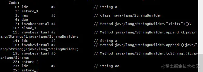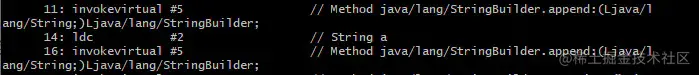 然后会添加s和"a",这里我们可以看出第一次添加的时候需要通过ldc出栈解析了字符串s的值,然后添加到StringBuilder对象中。