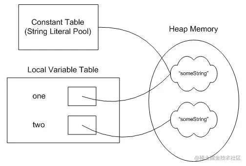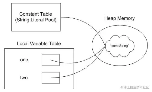 执行完上面的第一句代码之后,会在堆上创建一个String 对象,并把String 对象的引用存放到字符串常量池中,并把引用返回给 one,那当第二句代码执行时,字符串常量池已经有对应内容的引用了,直接返回对象引用给 two。one.equals(two) / one == two 都为true。 图形化如下所示: