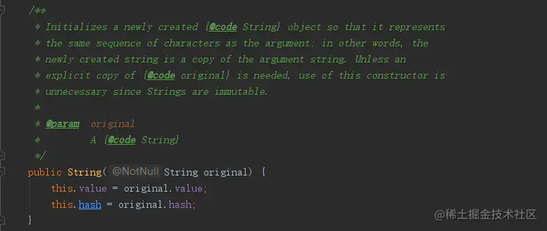 这个构造函数只是将"a"的value和hash赋值给了新创建的对象,而value是char[]类型的数组,hash也是int类型,这两个都不可能对字符串常量池访问,所以真正的原因只可能是传入的"a"是从字符串常量池中获取的,所以我们在new String()的时候有可能会生成两个对象。