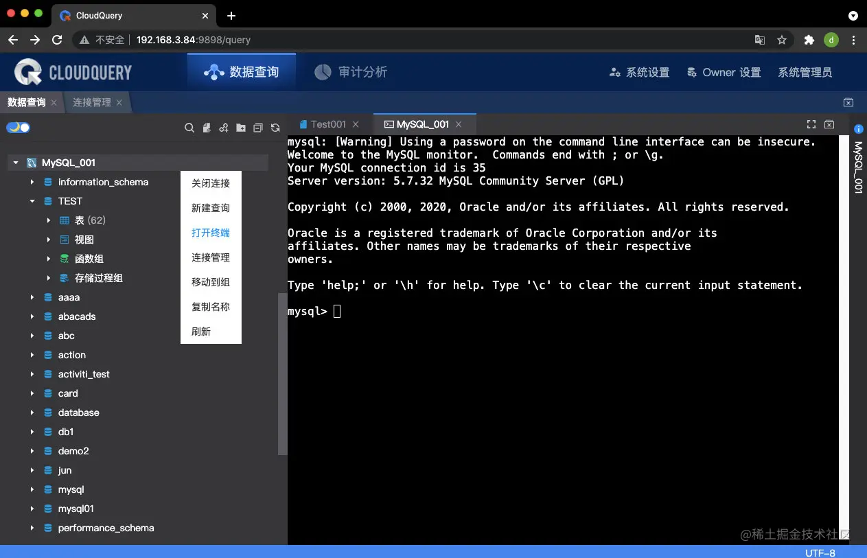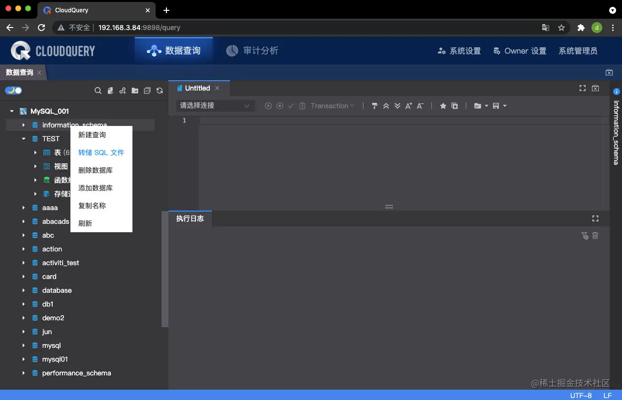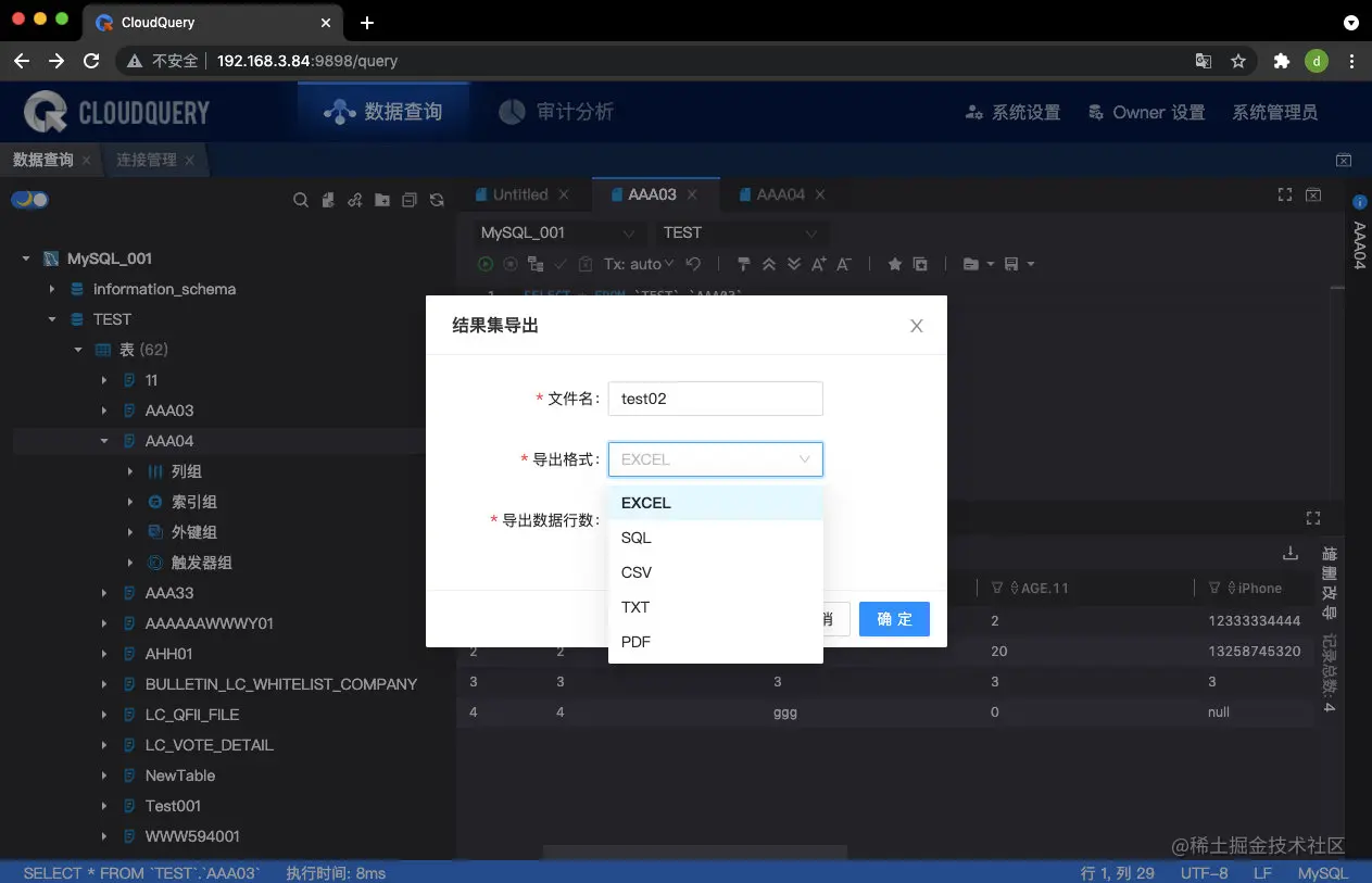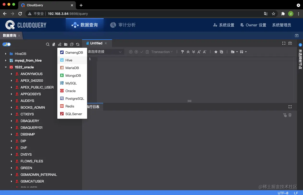 CloudQuery 是一个基于 Web 的数据库管理工具,仅需要一个浏览器便可以登录;支持众多数据库,如 Oracle、PostgreSQL、达梦数据库、Hive、MySQL 等,并将所有的数据库纳管到同一入口,统一管理数据库使用者。既免去了运维人员以往需针对不同数据库打开不同工具的麻烦,也结束了开发者使用数据库时杂乱无章的局面。