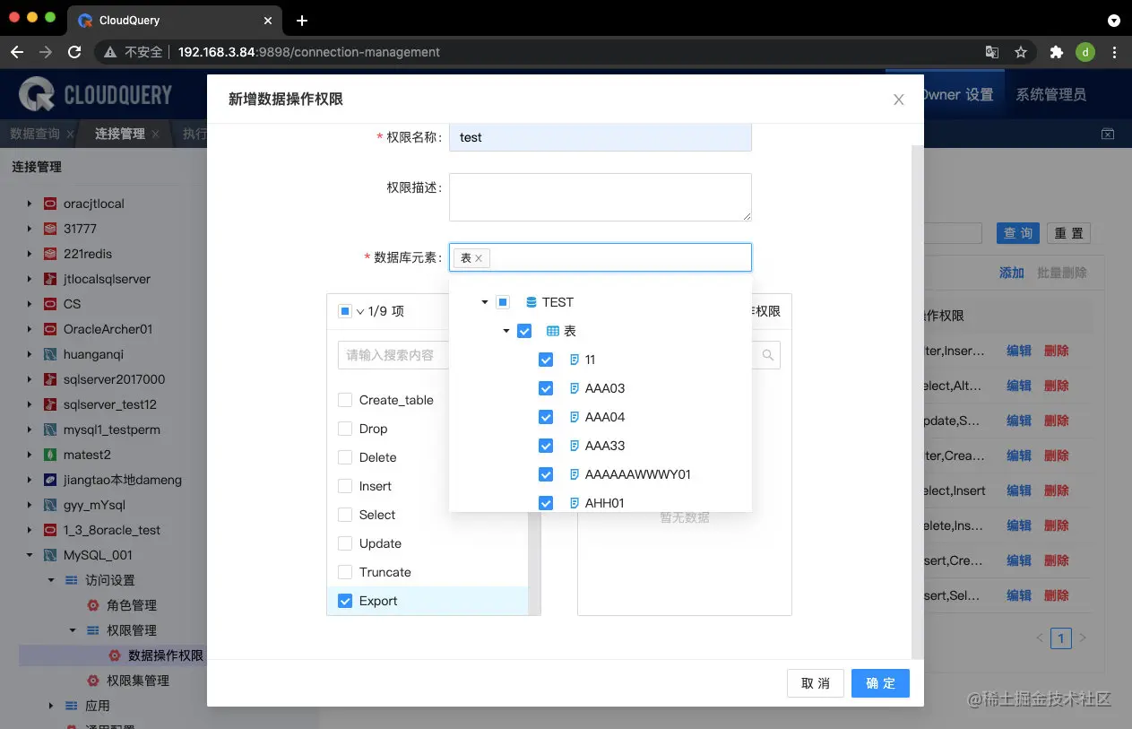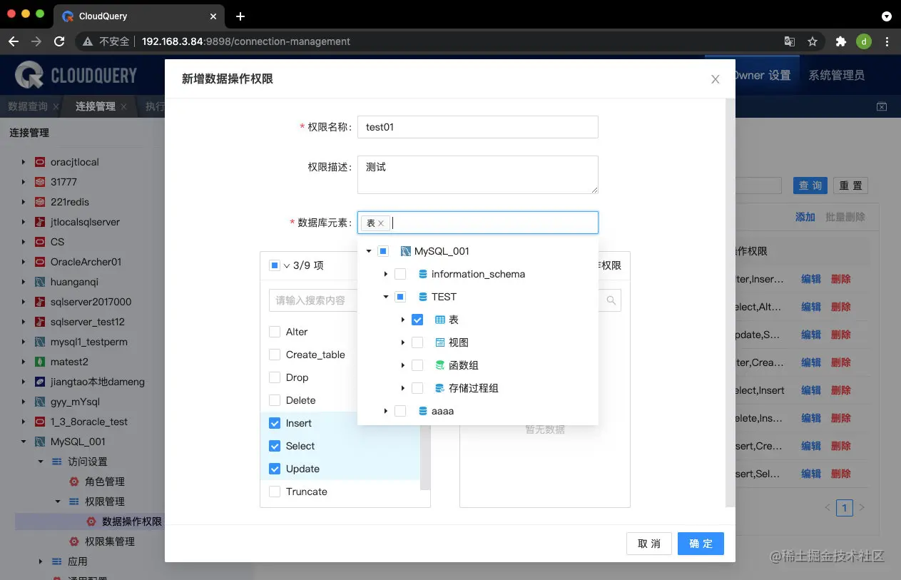 - 数据操作权限控制,可详细到某个连接的某个库的某张表的具体操作。