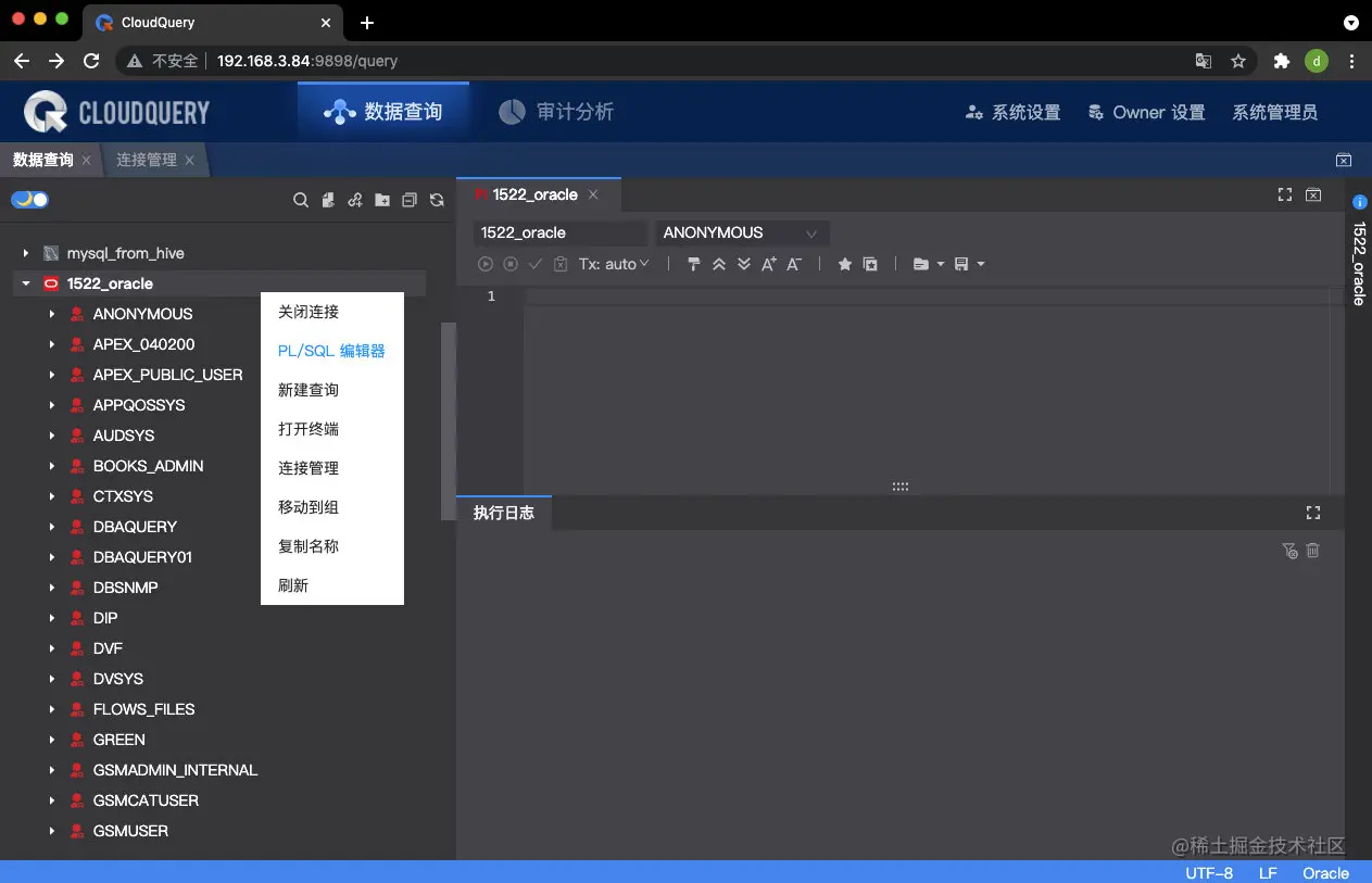 - 支持 Oracle PL/SQL 编辑器:对于经常习惯使用 PL/SQL 编辑器的朋友无需担心,CloudQuery 已支持 PL/SQL 编辑器,相信你上手后会有不同的体验。