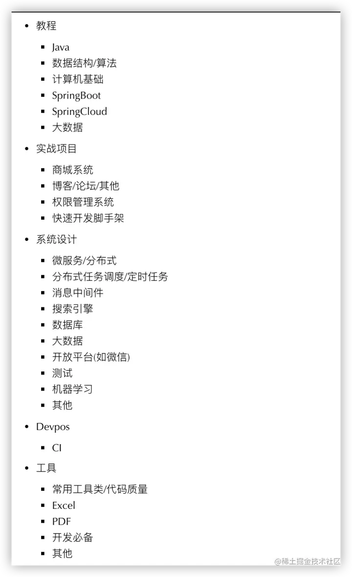 不论你想要看 Java 教程方向的开源项目、Java实战项目、SpringBoot教程还是说想要看微服务、分布式相关的开源项目,你都可以在上面找到需要的资源! 项目的整个目录如下,可以说非常详细完善了!