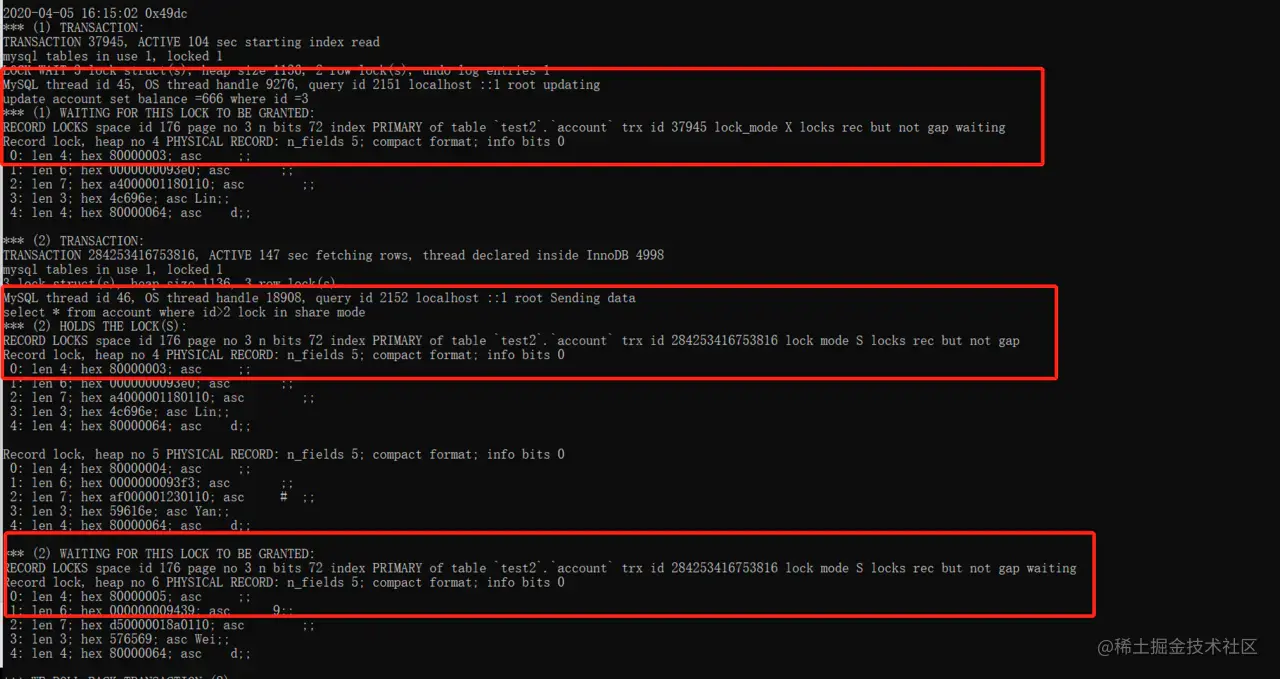 记录锁的事务数据(关键词:lock_mode X locks rec but not gap),记录如下: