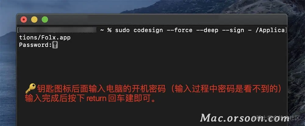 输入命令回车后会看见个 password 后面还有个钥匙图标,在钥匙图标后面输入你自己电脑解锁密码(输入的时候不显示你输入的密码,感觉就是输入不了东西一样,也不用管,凭感觉输入完正确解锁密码后按回车键)