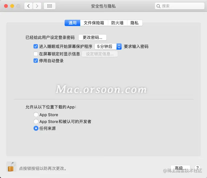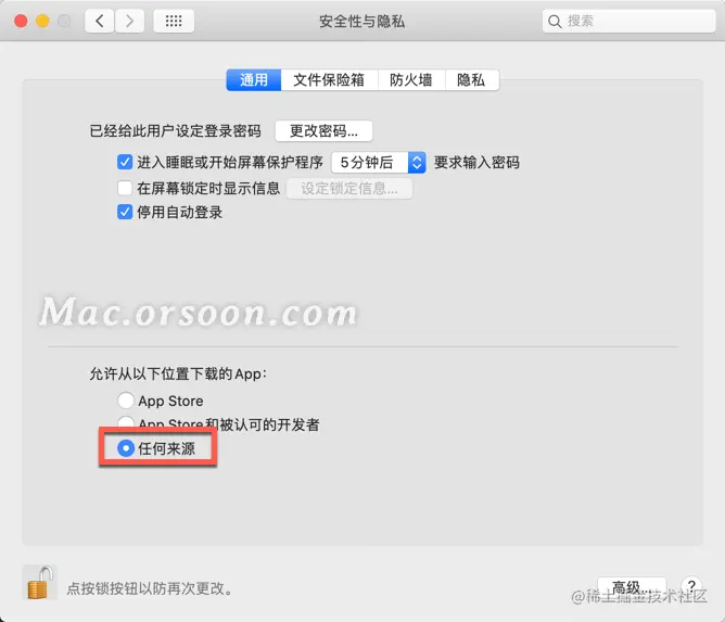 先打开 系统偏好设置 -> 安全与隐私 -> 通用 选项卡,检查是否已经启用了 任何来源 选项。如果没有启用,先点击左下角的小黄锁图标解锁,然后选中任何来源。
