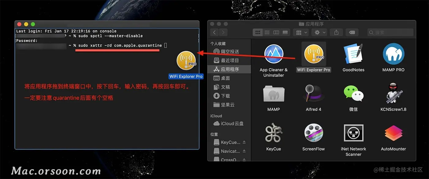 打开Finder(访达),点击左侧的 应用程序,将应用拖进终端中,然后按键盘的回车键(return),输入密码,再按回车键,完成。