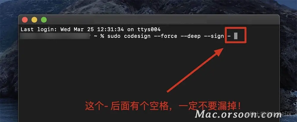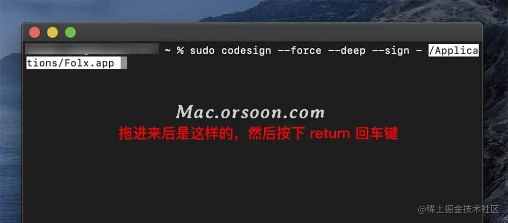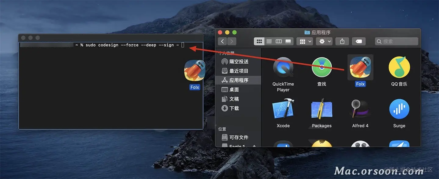 codesign --force --deep --sign - /文件位置(直接将应用拖进去即可)