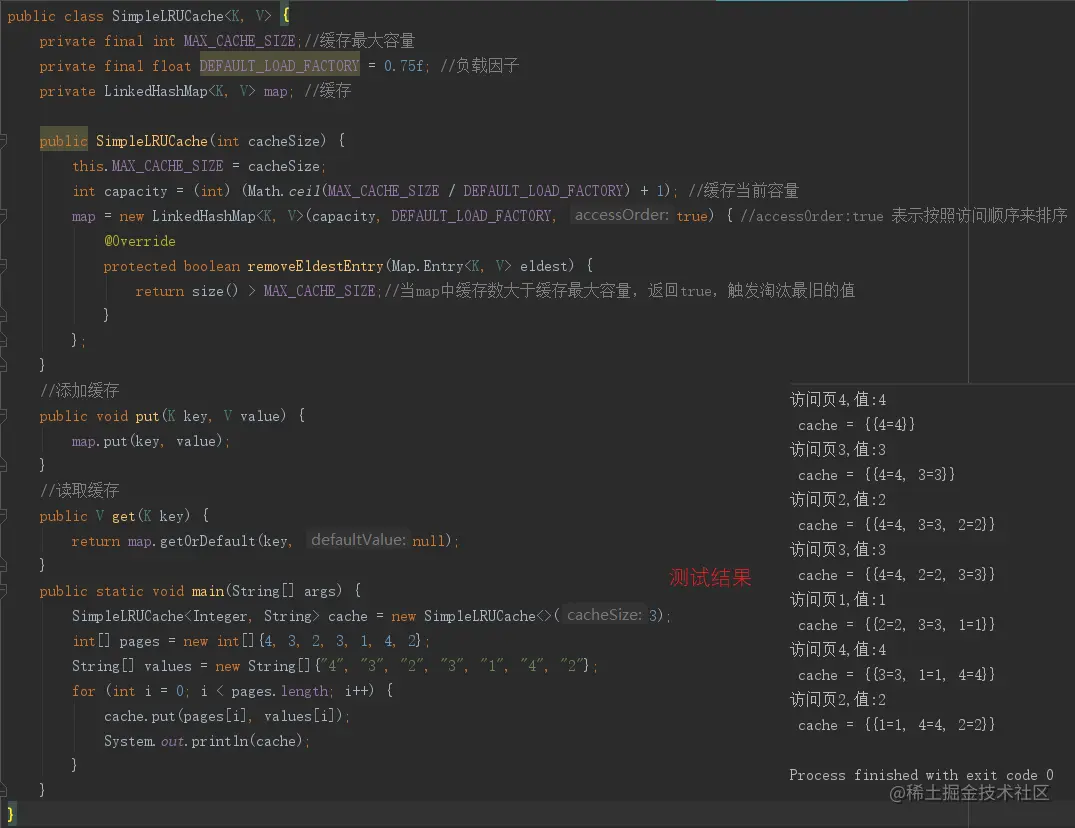 在Java集合类中,LinkedHashMap这种数据刚好就是这种结构,并且它也提供了按照访问顺序的排序方案,我们只需要重写removeEldestEntry方法即可,当该方法返回true的时候,就会删除最旧的节点,所以我们可以用这种结构快速的实现LRU,如下图所示: