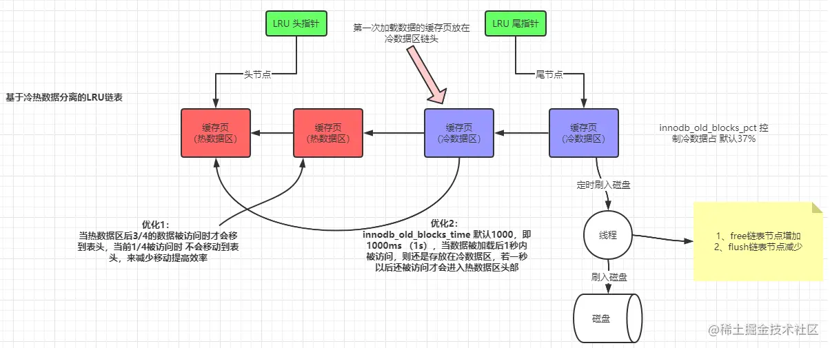 首先不管是不是基于冷热数据隔离的LRU链,基于我们前面所讲,会有后台线程定期将缓存页刷回磁盘,那么刷的是什么缓存页? 很显然:冷链末尾的缓存页。