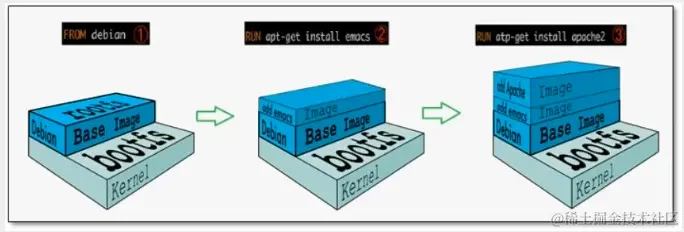 就会在基础镜像层之上创建第二个镜像层;如果继续添加一个安全补丁,就会创健第三个镜像层该像当前已经包含3个镜像层,如下图所示(这只是一个用于演示的很简单的例子)。