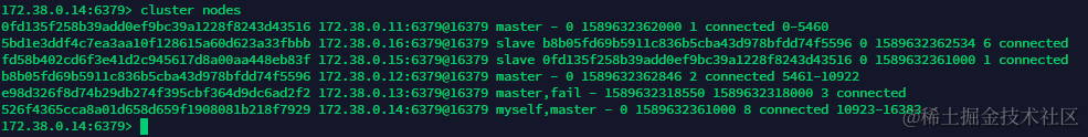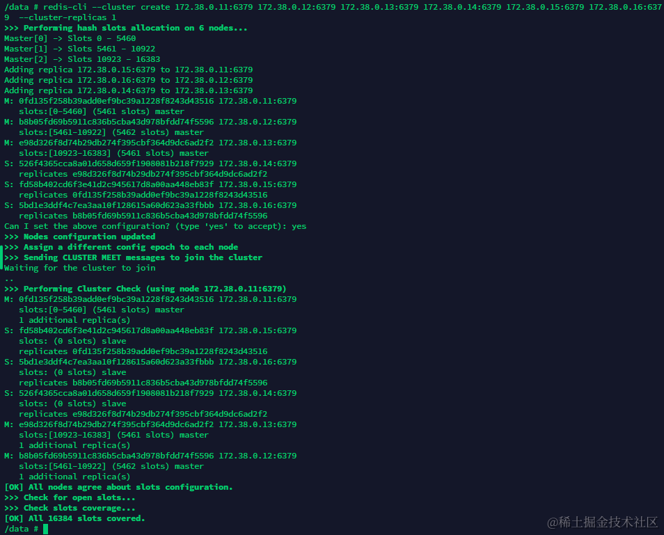 redis-cli --cluster create 172.38.0.11:6379 172.38.0.12:6379 172.38.0.13:6379 172.38.0.14:6379 172.38.0.15:6379 172.38.0.16:6379 --cluster-replicas 1