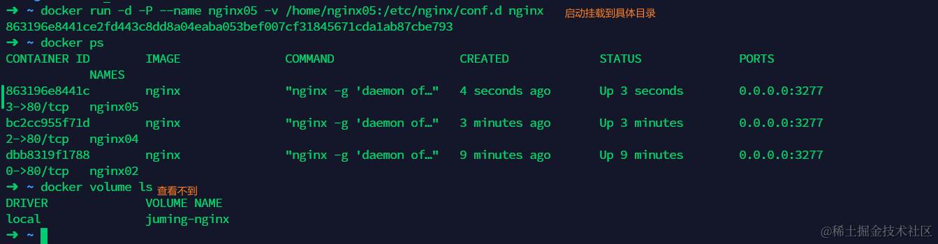 $ docker run -d -P --name nginx02 -v juming-nginx:/etc/nginx nginx