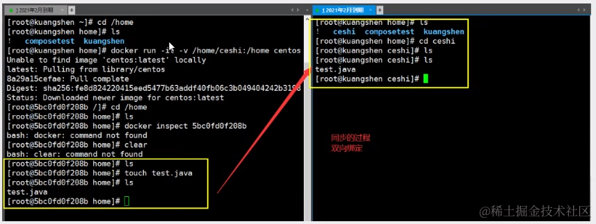 #这时候主机的/home/ceshi文件夹就和容器的/home文件夹关联了,二者可以实现文件或数据同步了