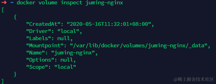 "Mountpoint": "/var/lib/docker/volumes/juming-nginx/_data", #默认目录