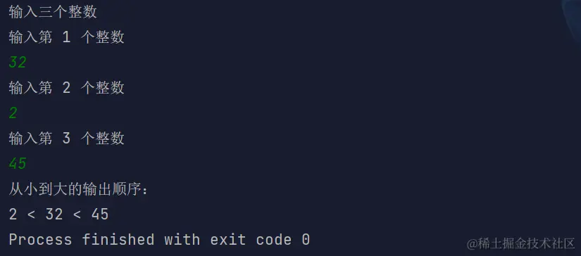 System.out.println("从小到大的输出顺序:");
