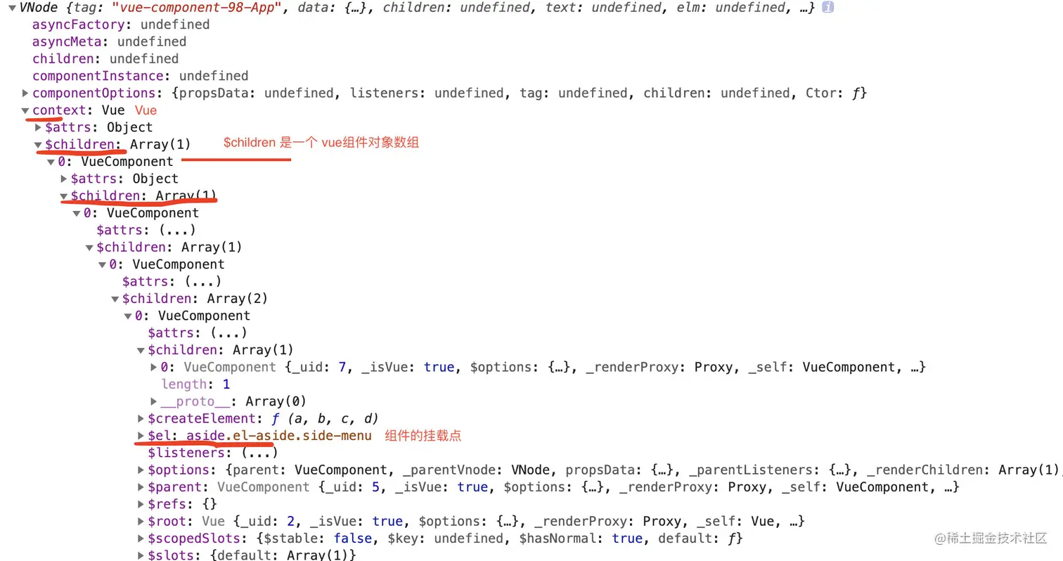返回值往往是一个单节点,划线的 context 是 vue 全局对象,有 el 是组件挂载点,_uid 是组件 id。