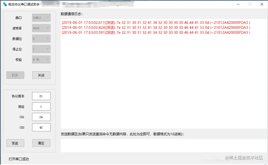 使用这个工具时,只需要填写电总协议的版本、设备地址、CD1、CD2和要发送的数据即可。串口的参数和设置其他的串口调试助手一样。