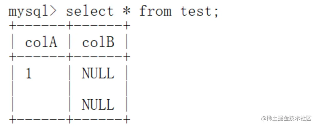 发现向colA一列插入空值成功,而colB列既可以插入空值,也可以插入NULL值。