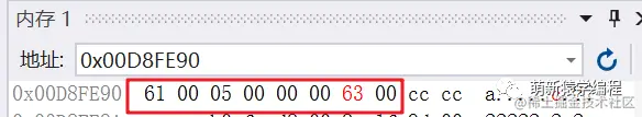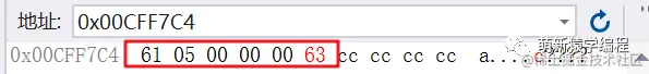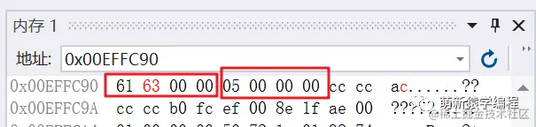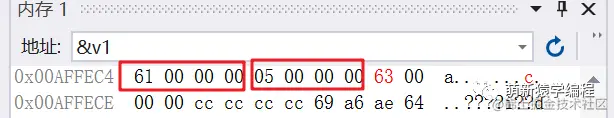 确实初始化为12个字节的0,那我们字符赋值字符‘a’,int值5以及字符‘c’之后,内存中又是如何存放的呢?