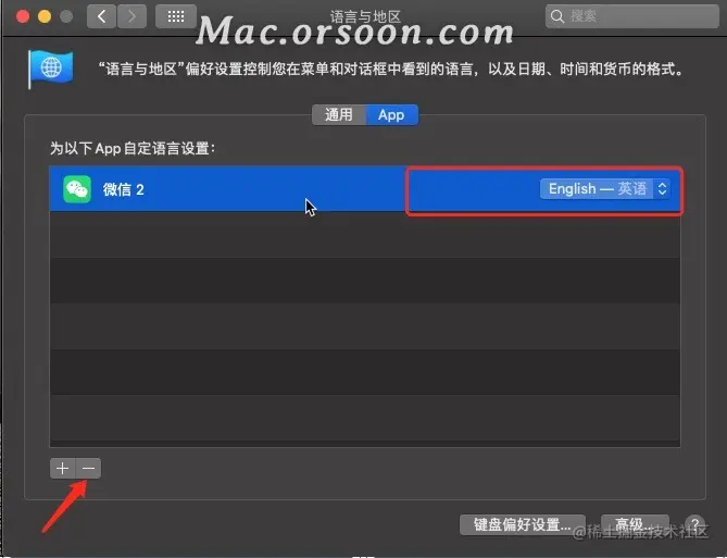 7.同样,您可以向此列表添加任意数量的应用程序。要删除应用程序的语言设置,请选择它,然后单击此处所示的“-”图标。您也可以在同一菜单中切换到不同的语言。
