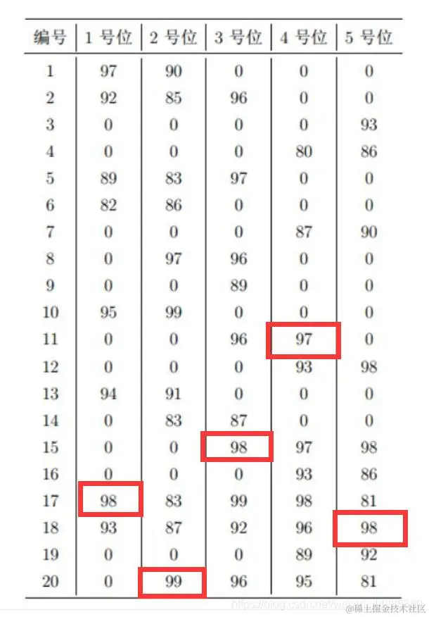在这里要注意的就是,如果说某一个球员在多个位置上都是最高分的话,在之前的位置上选取了该球员之后,在其他位置上就不能选该球员了,应该选择分数第二高的球员,按照该方法,选取出来的5个位置对应的球员及其在该位置上的分数如下图(其中一种选择):
