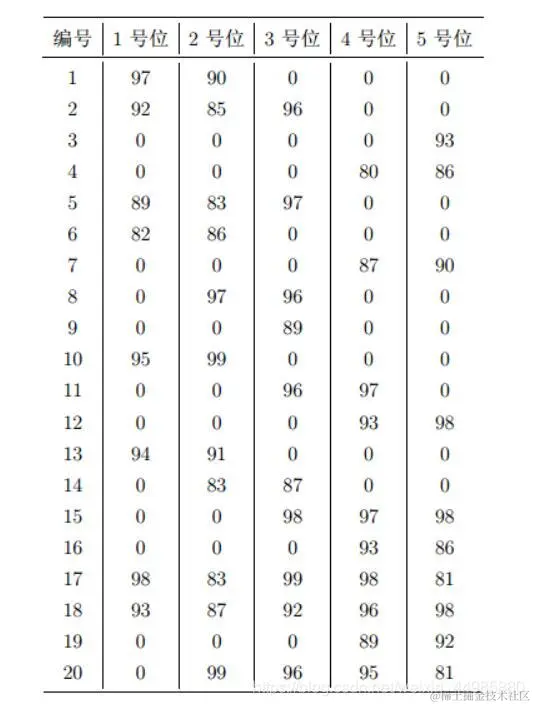 这道题属于试卷的第一道题,所以在计算思路上比较简单,一共是5个位置,每一个位置上的球员应该是互不相同的,同时既然是让最后的总评分达到最大,那么最简单的方法就是在20个球员中,我们先选取每一个位置上评分最高的球员,然后将选取出来的球员在该位置上的评分相加即可。