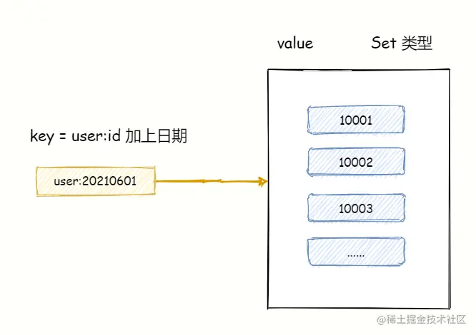 比如,2021-06-01 的总注册用户量存放在 key = user:20210601 set 集合中,2021-06-02 的总用户量存放在 key = user:20210602 的集合中。