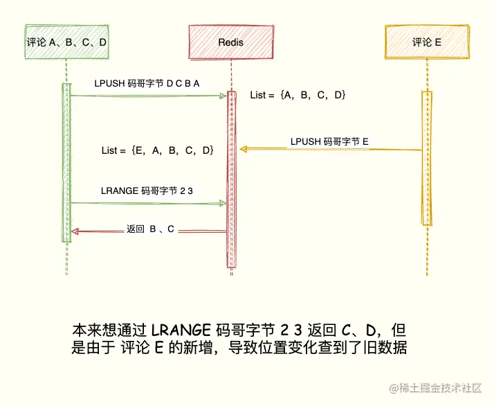如果在展示第二页之前,产生新评论 E,评论 E 通过 LPUSH 码哥字节 E 插入到 List 队头,List = {E, A, B, C, D }。